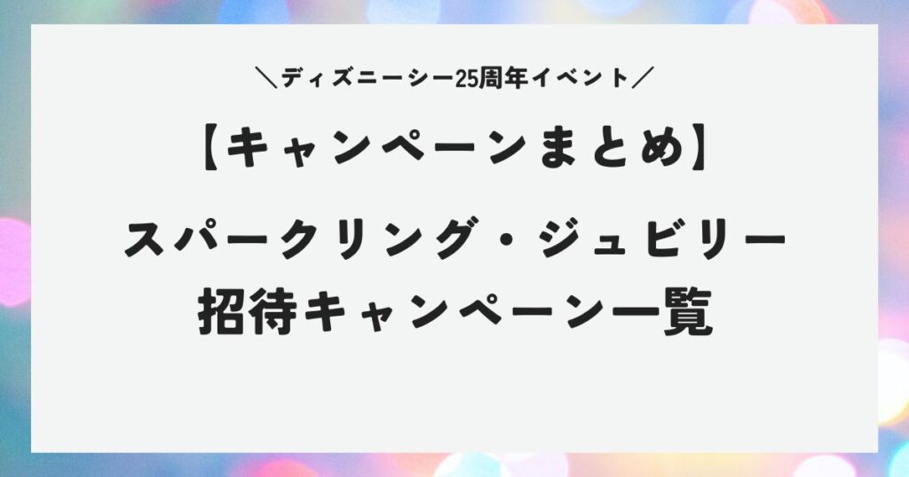 東京ディズニーシー25周年イベント「スパークリング・ジュビリー」の招待キャンペーンの懸賞をまとめました。 随時更新していますが、足りないものなどありましたらコメントで教えていただけると幸いです。 キャンペーンへの応募記録としてお使いください... -