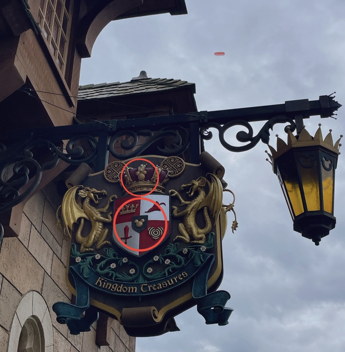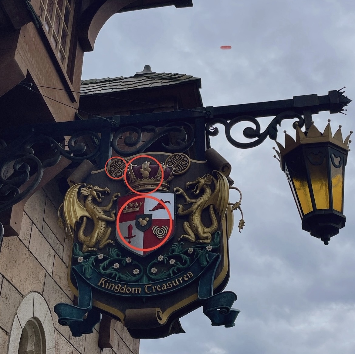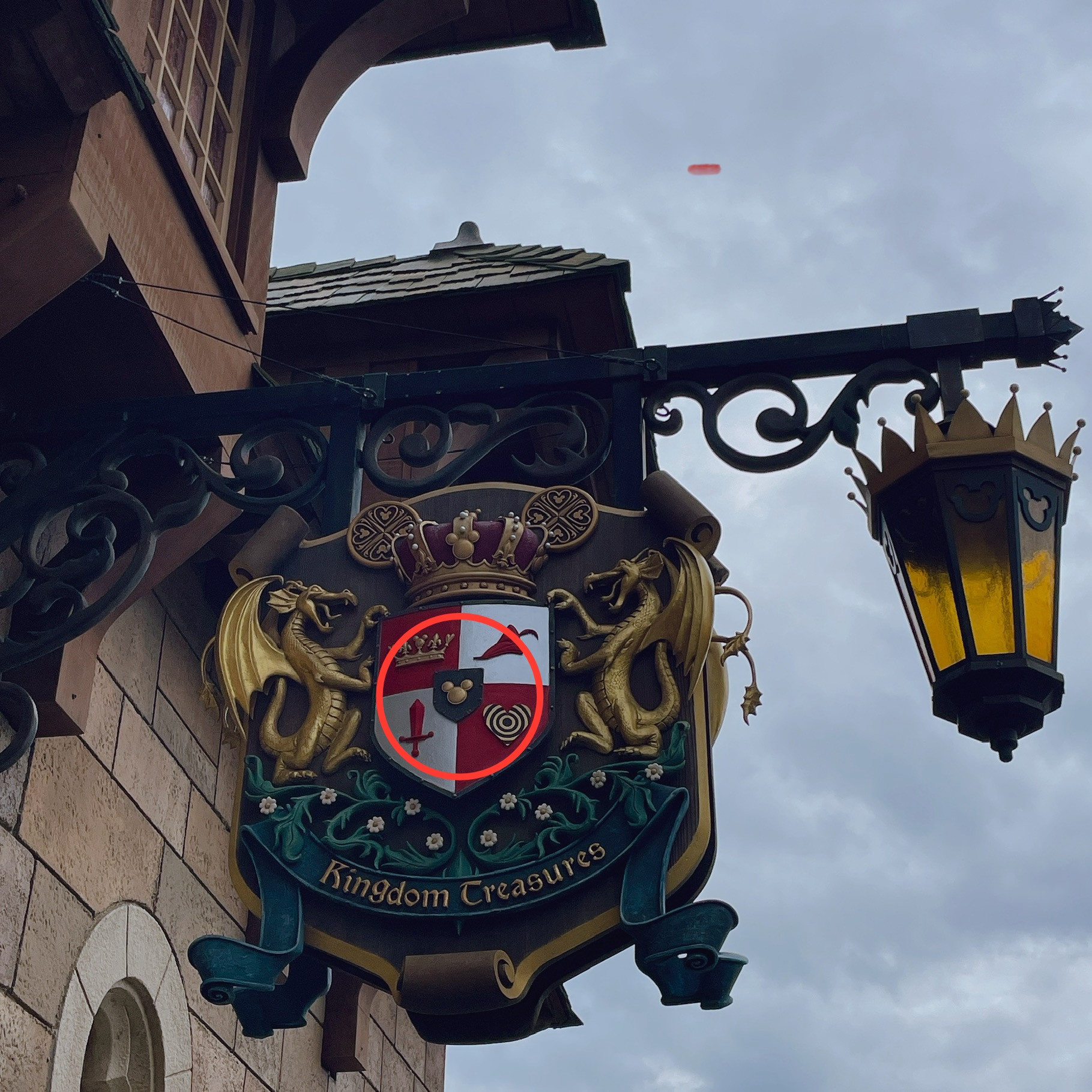 キングダムトレジャー 看板 盾の模様の中の隠れミッキー | ![]() 難易度: | 備考:盾の左上の模様に注目! |
