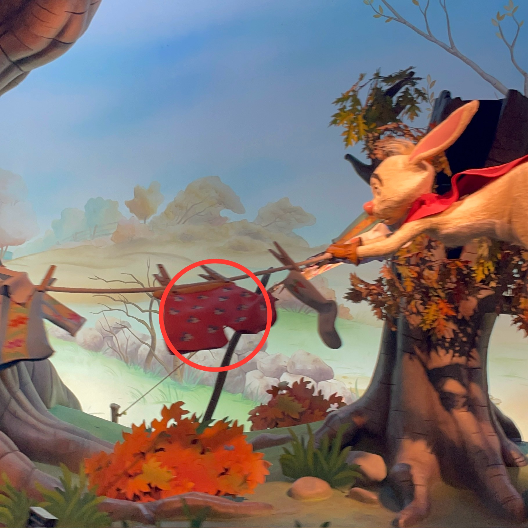 アトラクション内 柄の隠れミッキー | ![]() 難易度: | 備考:飛ばされそうになっているラビットの洗濯物に注目! アトラクション中で一瞬で通り過ぎるので要チェックです! |