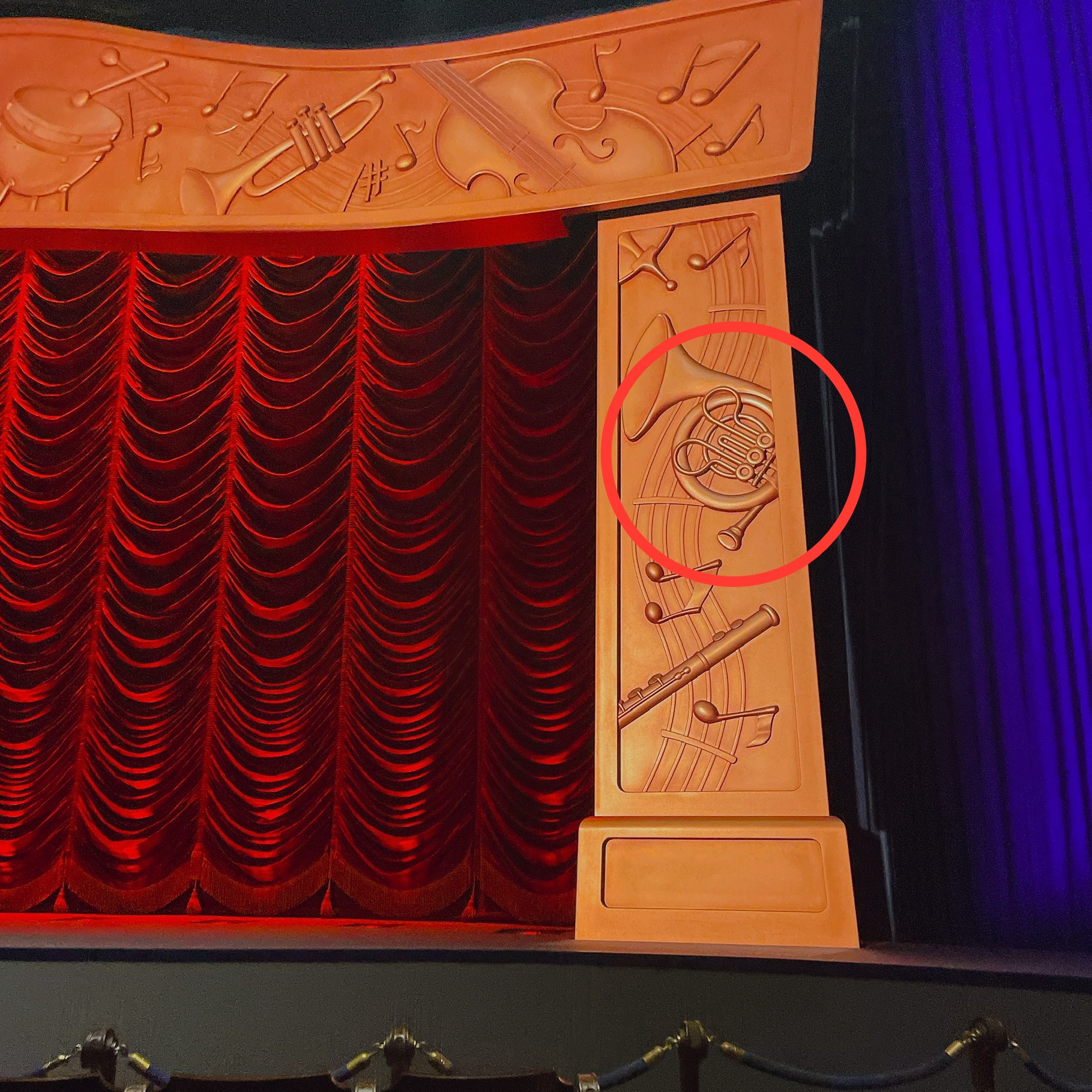 シアター内 舞台右側 楽器の隠れミッキー | ![]() 難易度: | 備考:舞台右側に注目!楽器のホルンが隠れミッキーになっています |
