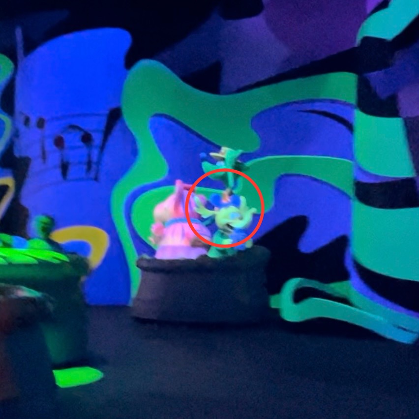 アトラクション内 帽子の隠れミッキー | ![]() 難易度: | 備考:プーさんの夢の中のシーンで、「ズオウとヒイタチ」が乗るポットも一緒に周っています。ズオウの帽子に注目してみよう!一瞬なので、見逃さないように! |
