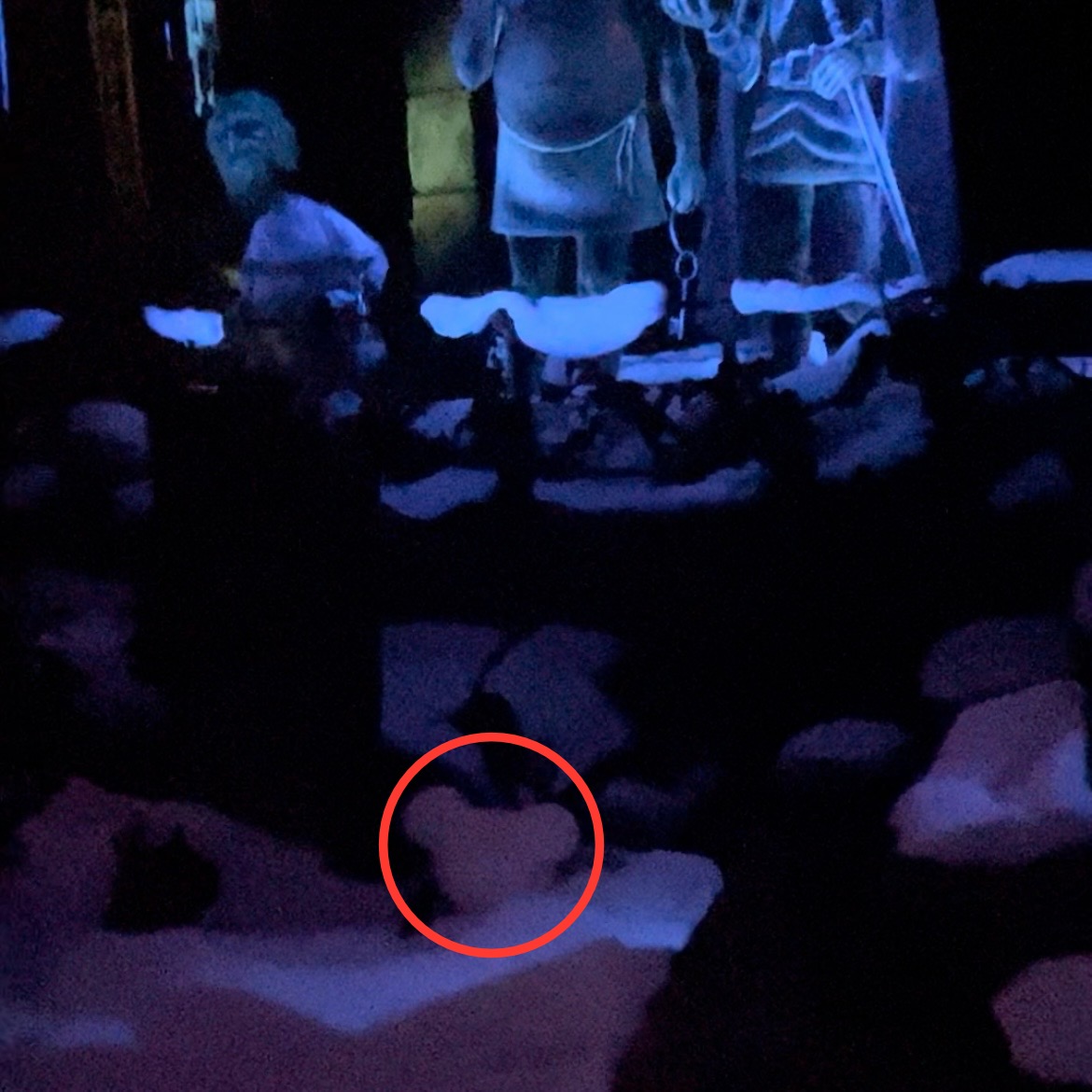 アトラクション内 墓地 雪の隠れミッキー | ![]() 難易度: | 備考:墓地の最後の方、三人のゴーストの下に注目!ゴーストに目が行きがちなので、発見は難しい! |