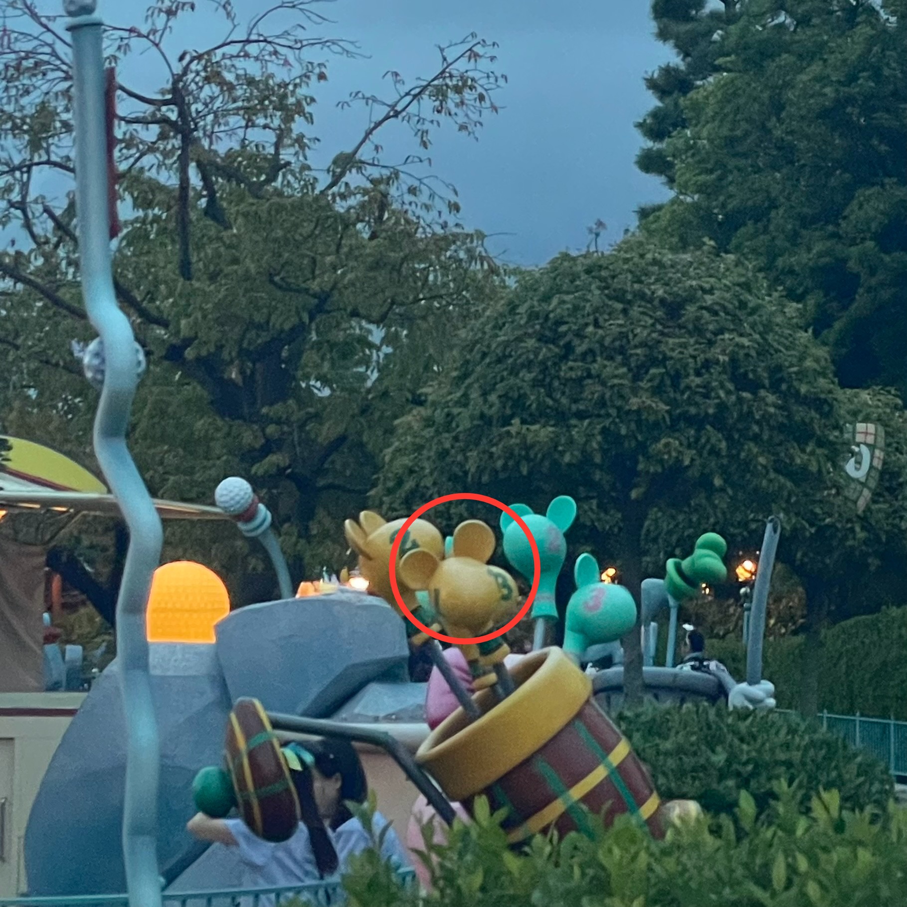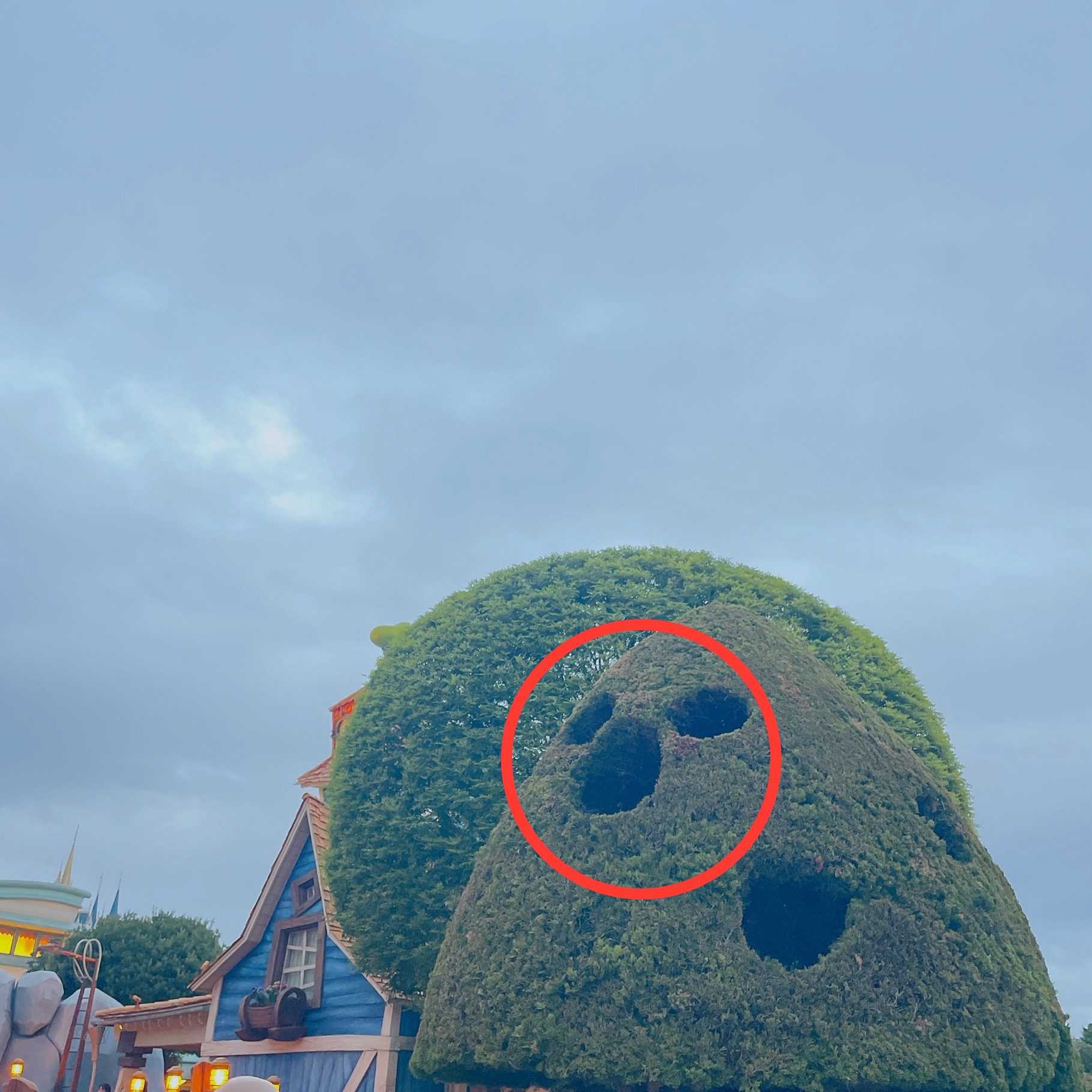 ドナルドのボート近くの木 木の隠れミッキー | ![]() 難易度: | 備考:これぞ「隠れミッキー!」という感じの王道隠れミッキー。 正面側ではなく、後ろ側にまわりこむとわかりやすい。 |