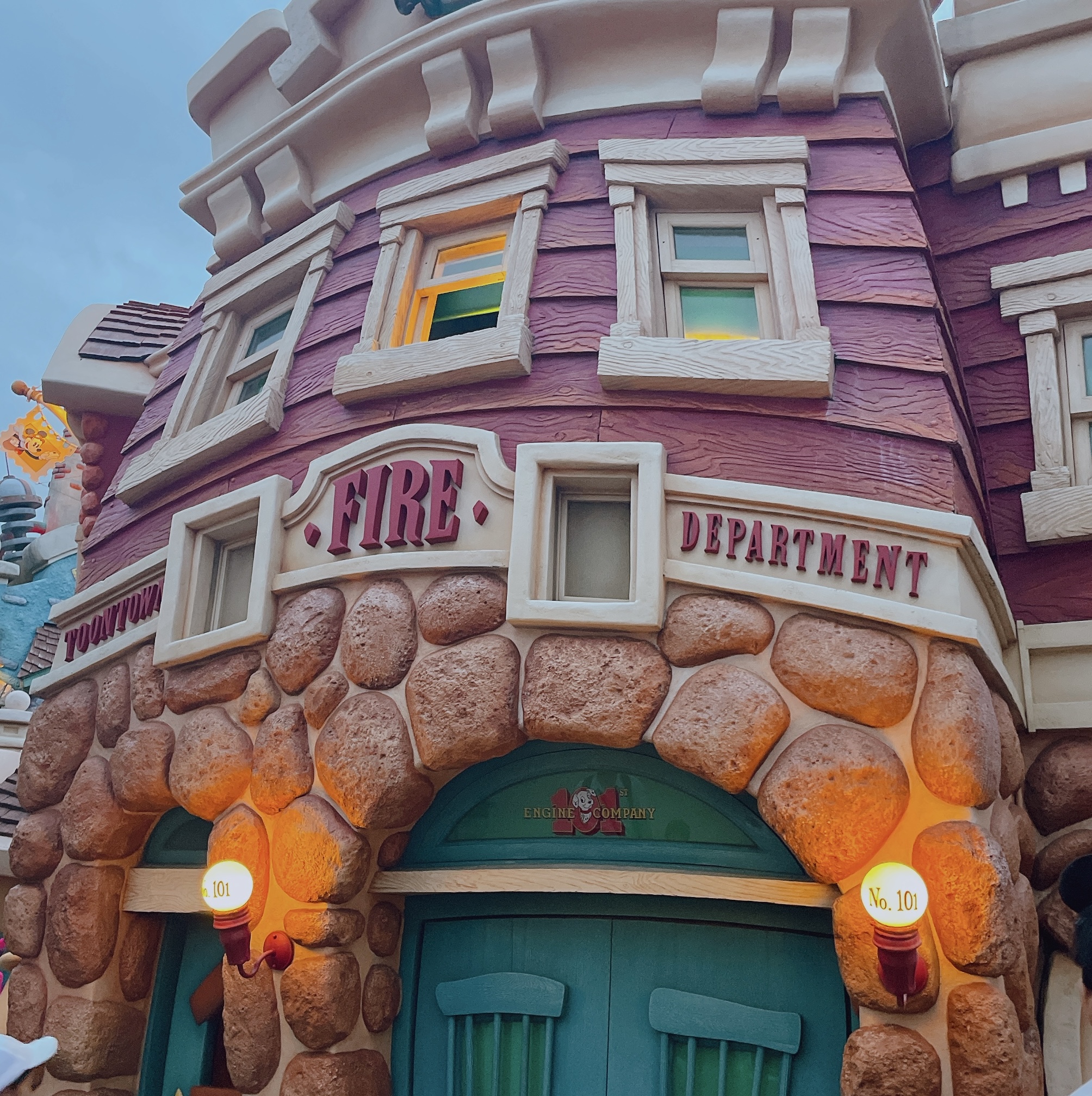 カートゥーンスピン前の小道には「消防署」や「郵便局」などの建物が建っており、様々な仕掛けで遊ぶことが出来る子どもたちも大好きなエリアです。