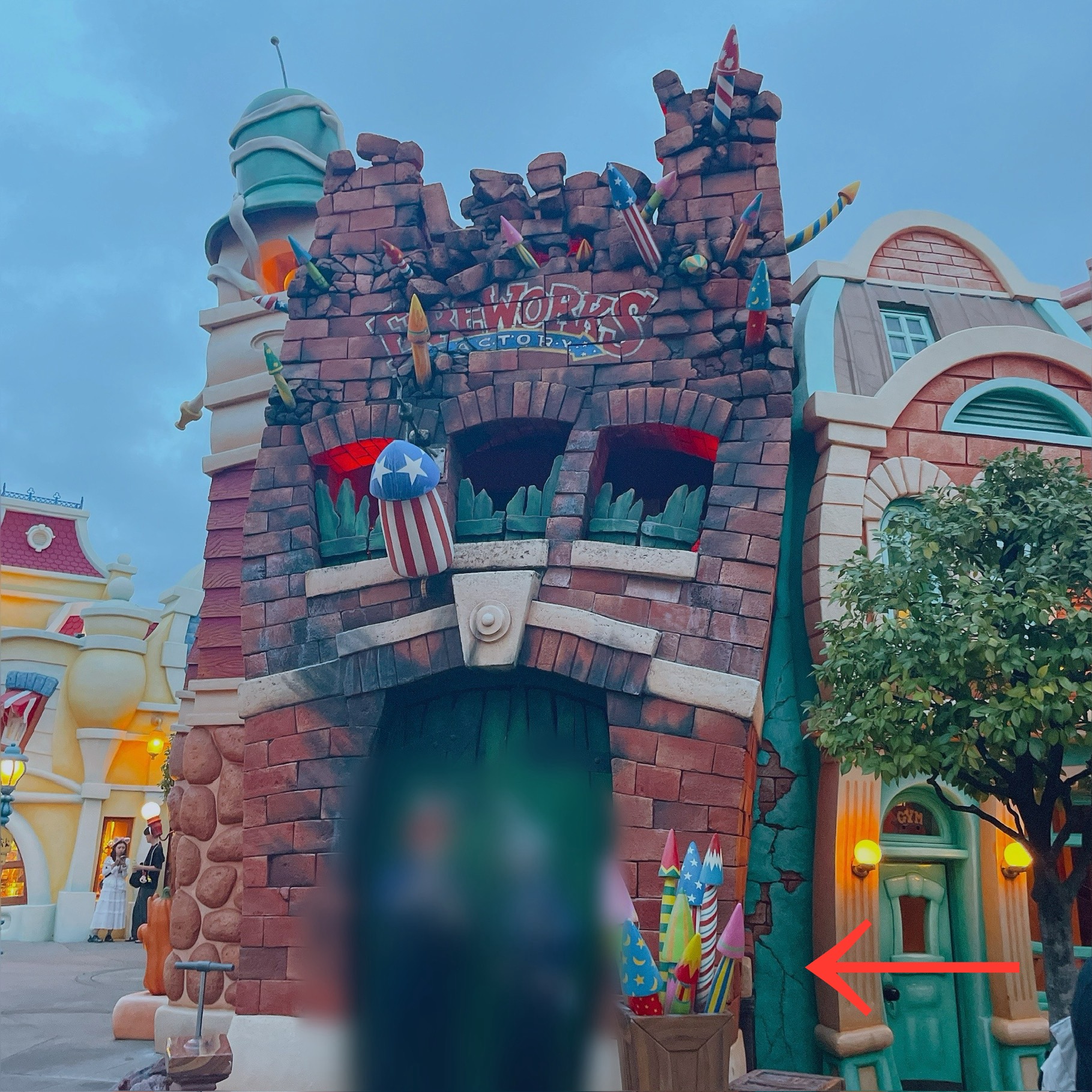 花火工場 鍵穴の隠れミッキー(激レア!) | ![]() 難易度: | ![]() 備考:花火工場の右側の隅(下の方)をのぞき込んでみよう! 全身サイズの激レア隠れミッキーがいますよ! |